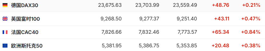 2. 截至发稿,德国DAX指数涨0.21%,英国富时100指数涨0.47%,法国CAC40指数涨0.84%,欧洲斯托克50指数涨0.38%。